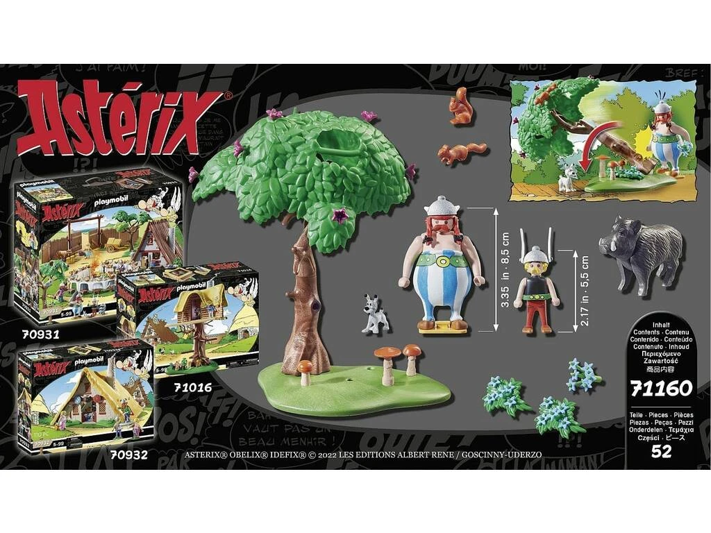 Incluye: 1 figura Astérix con casco, 1 figura Obélix con casco, 1 figura Idéfix, 1 figura jabalí, 1 escenario con árbol setas y flores, 2 figuras ardilla y flores azules.